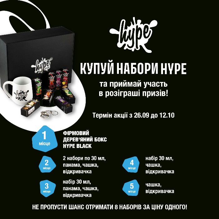 Компания Hype запускает розыгрыш для всех покупателей наборов! Каждая покупка на нашем сайте Lulka.net или в вейп шопах Vape Town (Харьков) автоматически участвует в акции. Не упусти шанс получить 8 наборов по цене одного и фирменные подарки!