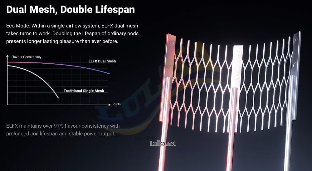 Современная технология нагревательных элементов, которая использует два слоя сетки вместо одного. Эти сетки обеспечивают увеличенную площадь нагрева, что положительно влияет на качество вкуса, количество пара и долговечность испарителя. За счет равномерного нагрева и улучшенного контакта с жидкостью, Dual Mesh картриджи потребляют меньше энергии, что увеличивает время работы устройства на одном заряде батареи.