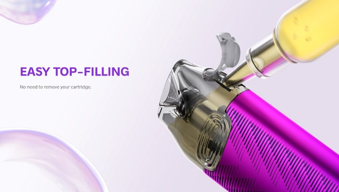 Удобная конструкция позволяет заправлять картридж без его извлечения. Просто откройте силиконовую крышку сверху и залейте жидкость — быстро, чисто и без проливов.