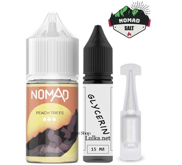 Жидкость Nomad Salt поставляется в виде набора компонентов для самостоятельного смешивания солевой жидкости, в который включены: аромабустер солевой Nomad Silent Peach Trees во флаконе 30 мл, который содержит 12 мл фирменного микс-ароматизатора, глицерин 15 мл. и никобустер на основе солевого никотина, что при смешивании позволяет получить готовую жидкость 50 мг/мл (Salt Nic 5%). Возможность добавления никобустера означает, что вы можете сделать жидкость с крепостью, которая вам больше подходит. Например, при добавлении половины объема никобустера, вы получите крепость 25 мг/мл. Солевой никотин обеспечивает мягкий удар по горлу и более быстрое усваивание организмом, что позволяет быстро утолить тягу к никотину. Nomad на солевом никотине имеют соотношение VG/PG 50/50. Мы рекомендуем использовать их для заправки Pod-систем.