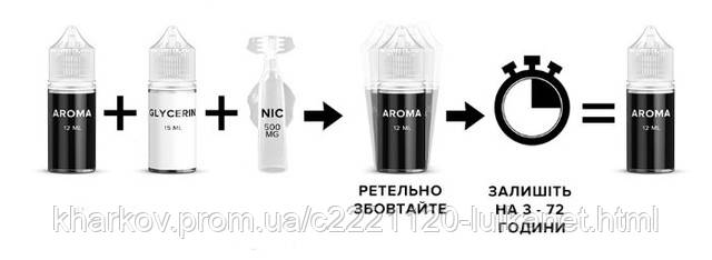 - Співвідношення PG/VG у готовій рідині: при додаванні у флакон з ароматизатором гліцерину 15 мл та нікобустера або нікотину 3мл, ви отримаєте готову рідину із співвідношенням PG/VG 50/50.