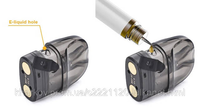 Щоб заправити картридж, його необхідно вийняти з батарейного блоку, відкрити силіконову заглушку і залити 2 мл рідини.