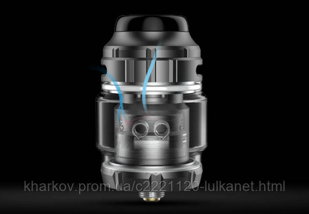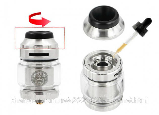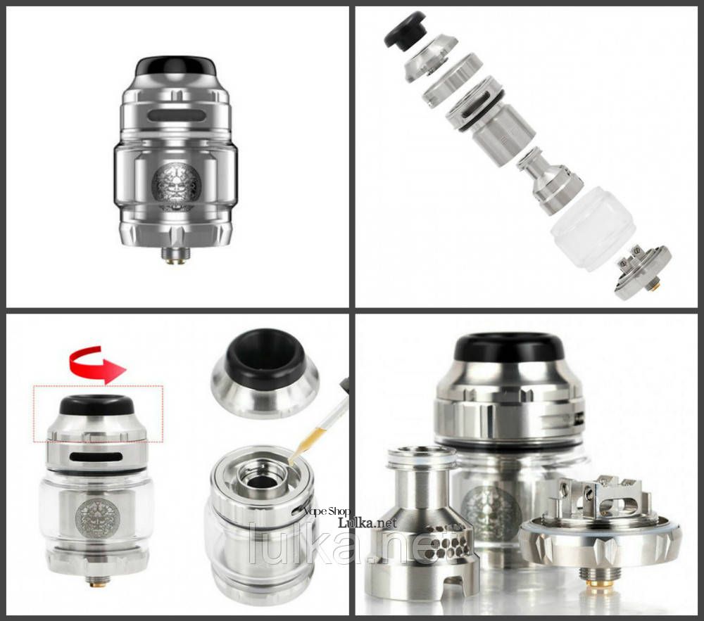 Бак-непроливайка Zeus X виготовлений з нержавіючої сталі і оснащений низькопрофільним 810 дріп-типом. Для заправки необхідно скрутити злегка вигнутий топ-кеп. Елементи забезпечили байонетним з'єднанням, яке сприяє мінімізації утворення крапель рідини.