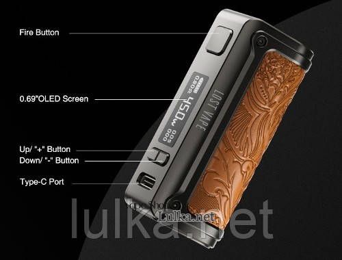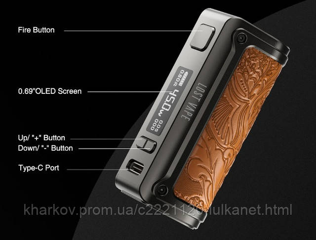 Корпус бокс-мода Lost Vape Thelema Mini виготовлений з цинкового металу. Для оздоблення використані вставки з тисненої штучної шкіри. На вузькій грані розташований монохромний дисплей діагоналлю 0,69”, кнопки включення та налаштувань, роз'єм для заряджання.