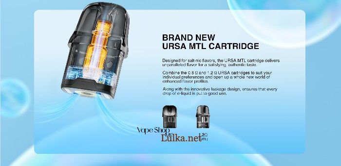 Комплектний змінний картридж Ursa nano забезпечує «смачну» тугу затяжку. Вдосконалений вбудований випарник розрахований на опір 1,2 Ом. Також можна використовувати MTL-модель з елементом 0,8 Ом. Заправка в обох картриджів збоку. Об'єм рідини - 2,5 мл.