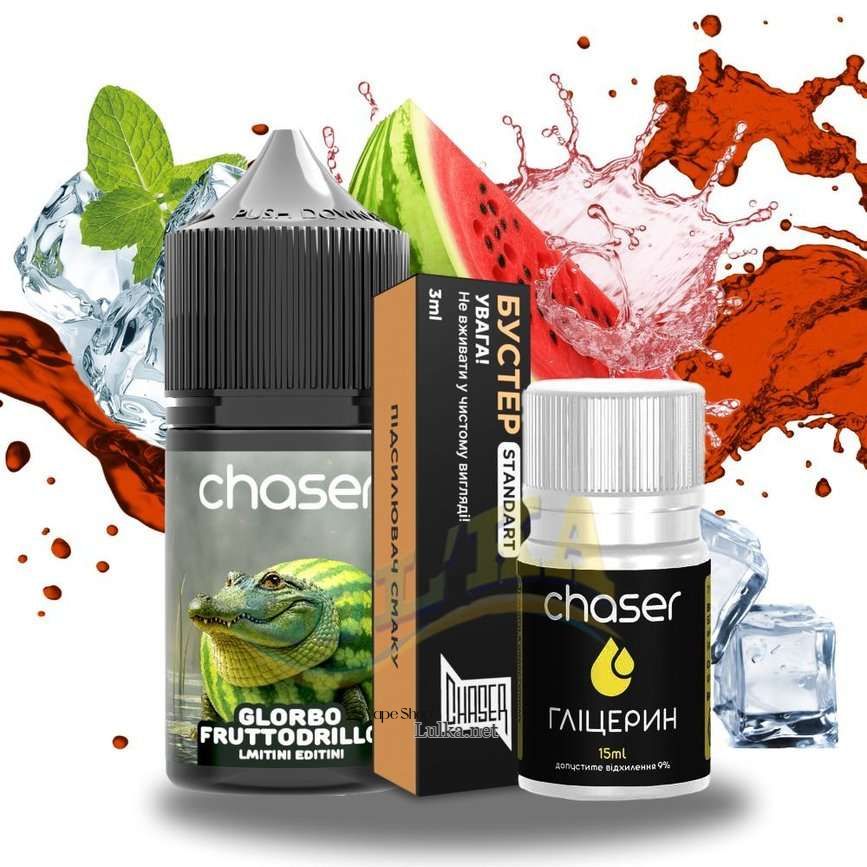 Набір Chaser Limitini Editini Glorbo Fruttodrillo (Кавун Лід) - лімітований комплект для самозамісу рідини від Chaser зі смаком соковитого кавуна та легкої свіжості. Усе включено: ароматизатор, гліцерин та підсилювач міцності 50 мг.