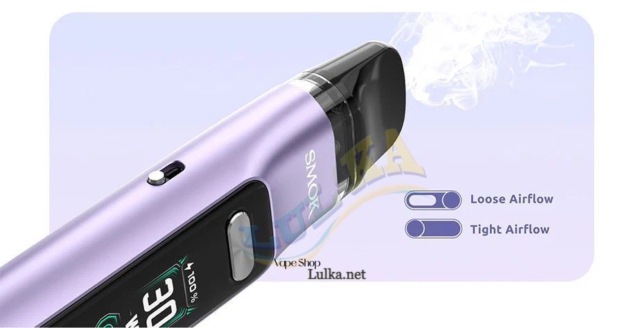 На вузькій стороні пристрою передбачено повзунок, що дозволяє точно налаштувати інтенсивність затяжки, щоб користувач міг вибрати комфортний рівень опору повітря. На протилежному боці корпусу розміщено кнопки для регулювання інших параметрів, а також роз'єм для заряджання пристрою. Такий підхід до розташування елементів забезпечує зручність використання та швидке керування налаштуваннями.