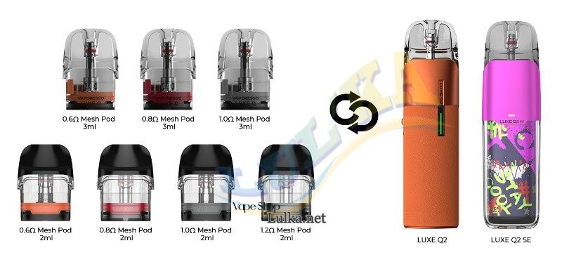 Пристрій комплектується змінними картриджами з випаровувачами на сітці, опір 0,6 або 1 Ом. Отвір для заправки знаходиться збоку. Об'єм картриджа становить 3 мл. Придбати змінні картриджі для POD-системи Vaporesso LUXE Q можна на нашому сайті ➡️ Картридж Vaporesso Luxe Q Pod Cartridge. Також можливе використання картриджів з попередньої серії.