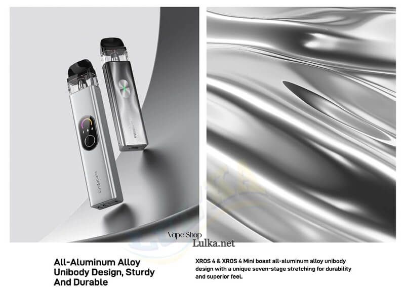 Корпус Vaporesso Xros 4 виготовлений з легкого та надійного алюмінієвого сплаву та пластику, пристрій міцний та стильний, доступний у різних колірних варіантах. Він виконаний у форматі стику із заокругленими гранями.