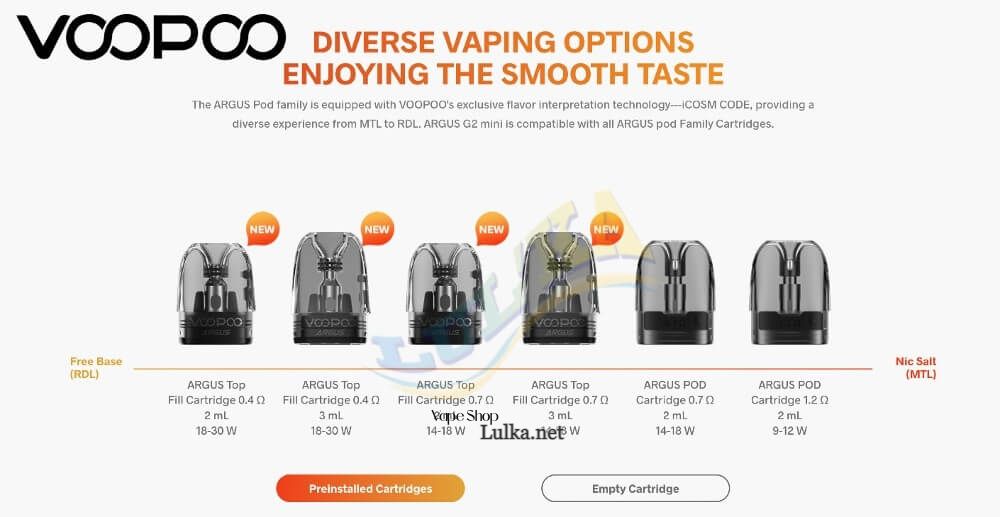 - Картриджі : Argus G2 Mini поставляється з картриджами ARGUS Top Fill Cartridge, що заправляються. Також пристрій сумісний і з попередньою лінійкою картриджів Аргус.