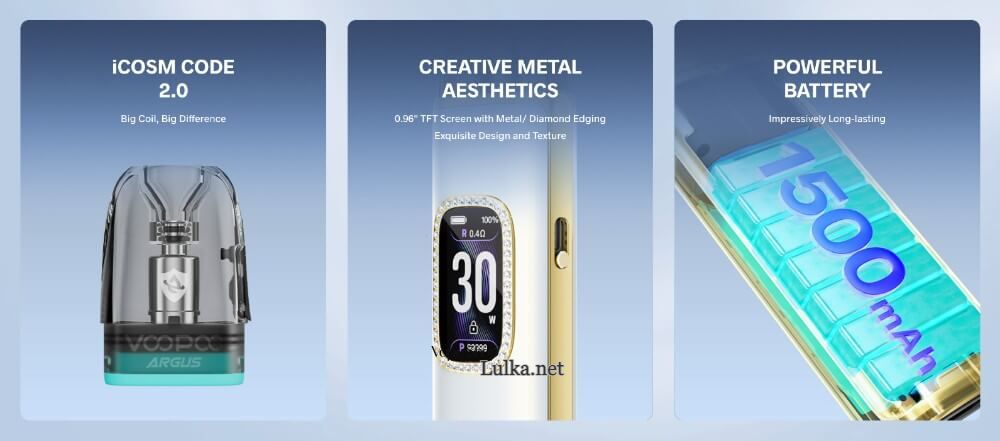 Voopoo ARGUS G3 сумісний з усією лінійкою картриджів ARGUS Pod, включаючи як попередні версії, так і оновлені картриджі ARGUS Top Fill V2. Це дає користувачеві свободу вибору між різними стилями затяжки – від насиченого RDL до класичного MTL – та опорами: 0.4Ω, 0.7Ω та 1.0Ω.