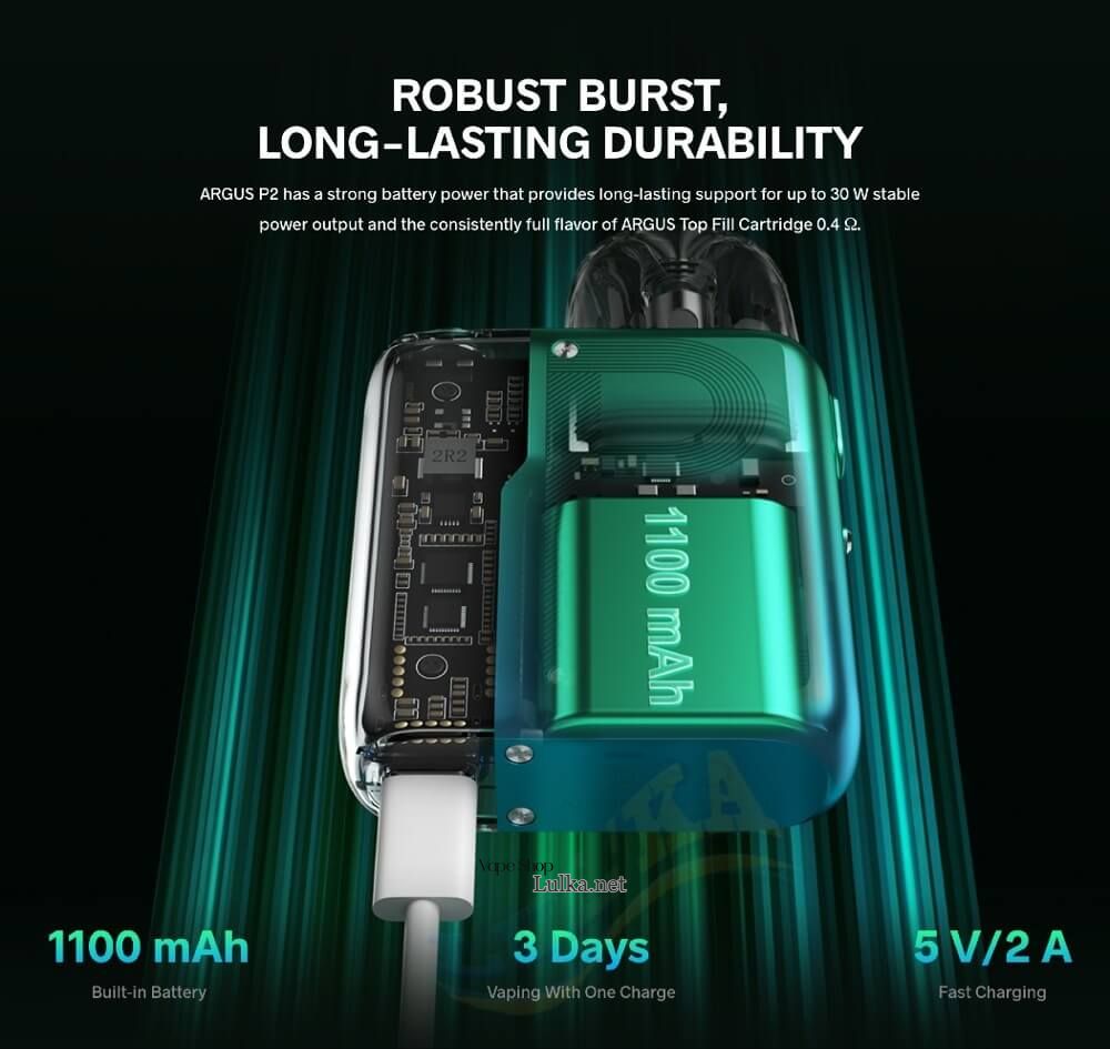 Батарейний блок ARGUS P2 укомплектований вбудованим акумулятором на 1100 мАг. Порт для заряджання сучасного зразка знаходиться на нижній межі пристрою. Працює подсистема в режимі варіват з можливістю вибору режиму.