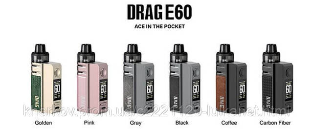 Drag E60 Pod Kit – пристрій середніх розмірів компанії Voopoo. Він потішить практичністю, високими показниками автономності. Виробник пропонує вибирати Voopoo Drag E60 Kit з 6 кольорів.
