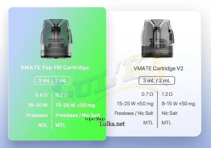 Картриджі VMATE Top Fill об'ємом 3 мл заправляються зверху, мають опір 0.4 Ω або 0.7 Ω та підходять як для сольових, так і для органічних рідин. Продумана конструкція та захист від протікань гарантують зручність і чистоту.