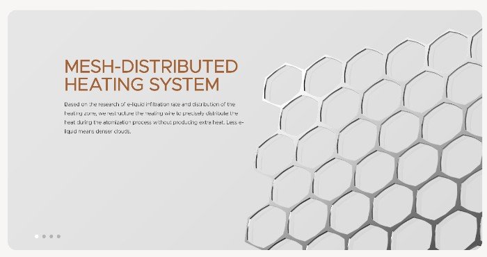 Технология Mesh-Distributed Heating System равномерно распределяет тепло по поверхности испарителя. Мелкая металлическая сетка прогревается стабильно и контролируемо, исключая локальные перегревы и потери вкуса. Это позволяет получить плотные облака пара, насыщенный вкус.
