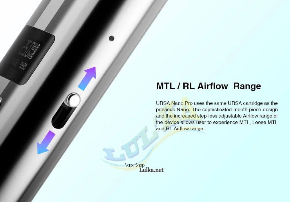 Lost Vape Ursa Nano Pro оснащен простым в использовании ползунком регулировки воздушного потока на боковой стороне устройства. Это позволяет пользователям контролировать, сколько воздуха поступает в устройство во время затяжки. Такая гибкая конструкция регулировки затяжки делает POD-систему подходящей как для новичков, так и для опытных вейперов, которые хотят настроить тягу в соответствии со своими предпочтениями.