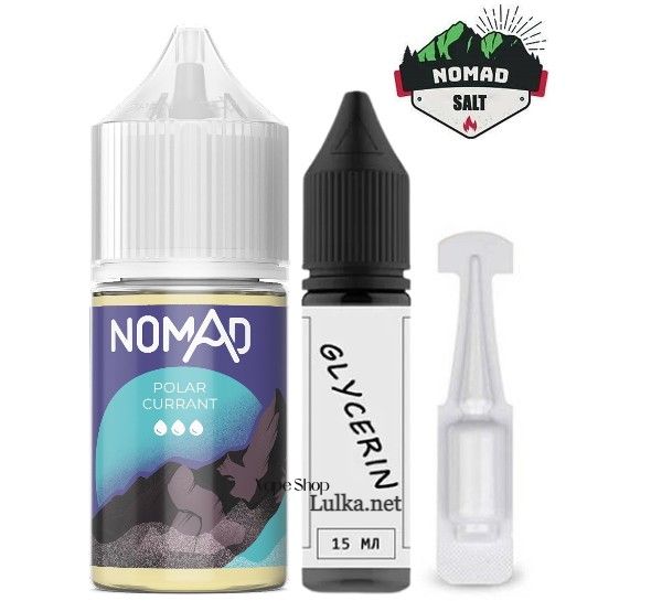 Жидкость Nomad Salt поставляется в виде набора компонентов для самостоятельного смешивания солевой жидкости, в который включены: аромабустер солевой Nomad Polar Currant во флаконе 30 мл, который содержит 12 мл фирменного микс-ароматизатора, глицерин 15 мл. и никобустер на основе солевого никотина, что при смешивании позволяет получить готовую жидкость 50 мг/мл (Salt Nic 5%). Возможность добавления никобустера означает, что вы можете сделать жидкость с крепостью, которая вам больше подходит. Например, при добавлении половины объема никобустера, вы получите крепость 25 мг/мл. Солевой никотин обеспечивает мягкий удар по горлу и более быстрое усваивание организмом, что позволяет быстро утолить тягу к никотину. Nomad на солевом никотине имеют соотношение VG/PG 50/50. Мы рекомендуем использовать их для заправки Pod-систем.