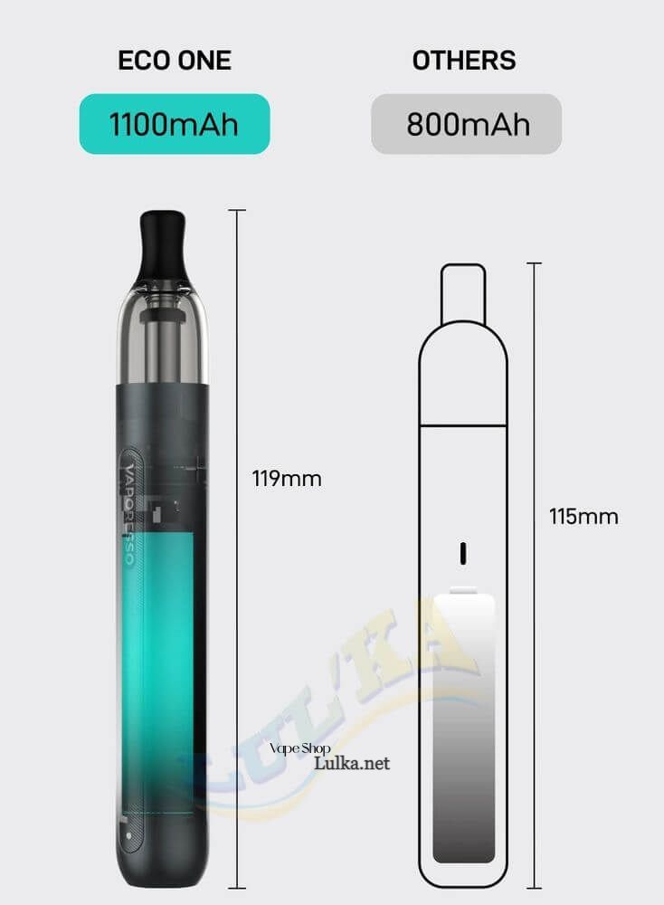 Vaporesso ECO ONE оснащена встроенным аккумулятором емкостью 1100mAh. Он обеспечивает продолжительное использование устройства на протяжении всего дня при умеренном парении. Это означает, что пользователям не нужно беспокоиться о частой подзарядке в течение дня, даже при активном использовании.