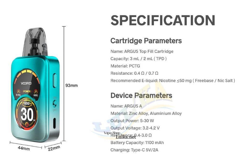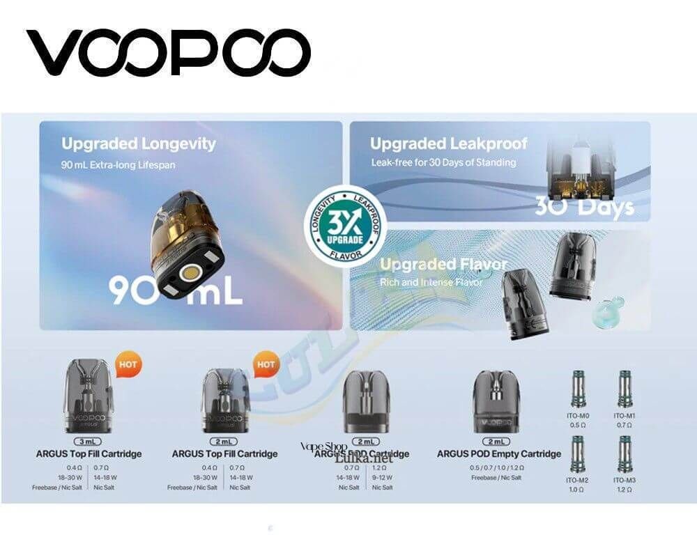 Совместимость с картриджами:Voopoo Argus Pod Cartridge 2.0ml (0.7 ohm) , Voopoo Argus Pod Cartridge 2.0ml (1.2 ohm) , Voopoo Argus Pod Top Fill 2.0ml (0.4 ohm) , Voopoo Argus Pod Top Fill 2.0ml (0.7 ohm) , Voopoo Argus Pod Top Fill 3.0ml (0.4 ohm) , Voopoo Argus Pod Top Fill 3.0ml (0.7 ohm) , Voopoo Argus Pod Top Fill 3.0ml (1.0 ohm)