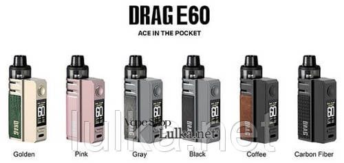 Drag E60 Pod Kit – устройство среднего размера компании Voopoo. Он порадует практичностью, высокими показателями автономности. Производитель предлагает выбирать Voopoo Drag E60 Kit из 6 цветов.