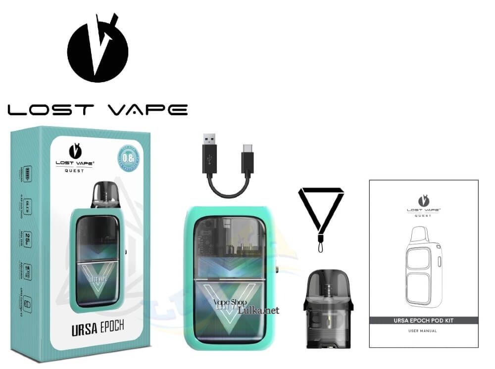 Багаторазова POD система Lost Vape Ursa Epoch Pod Kit виготовлена у вигляді прямокутника зі скошеними гранями. Полімерна основа додатково покрита шаром силікону. Яскравий дизайн у деяких моделях доповнений флуоресцентним ефектом. На верхньому торці поруч із плескатим мундштуком розташовується петля для кріплення темляка. Передня панель з прозорою поверхнею включає невеликий дисплей та ефектну вставку з підсвічуванням. На одній із вузьких граней розташовується повзунок регулювання інтенсивності затяжки. На протилежній – роз'єм для заряджання. Активується пристрій від затяжки.