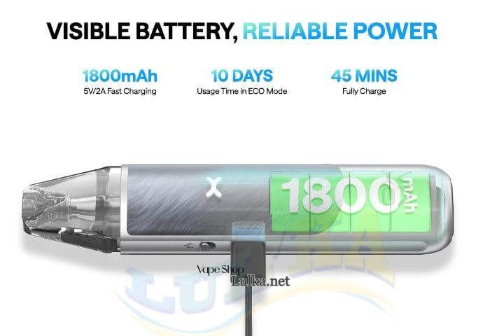 АКБ на 1800 мАг забезпечує до 10 днів автономної роботи в ECO-режимі — це одна з найвитриваліших POD‑систем у своєму класі.