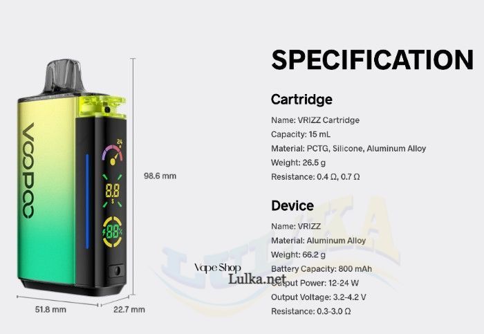 Сумісність з картриджами:Voopoo Vrizz Pod 15ml (0.7 ohm) , Voopoo Vrizz Pod 15ml (0.4 ohm)